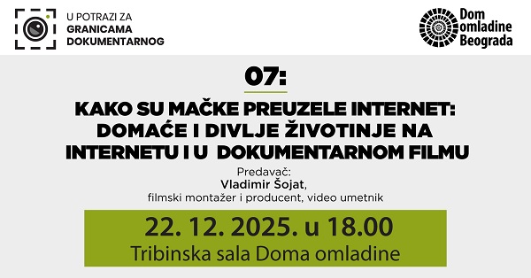 Poslednje predavanje iz ciklusa "NOVI DOKUMENTARIZAM (DOKUMENTARNI FILM, NOVE TEHNOLOGIJE, NOVI TRENDOVI)" u ovoj godini, zakazano je za ponedeljak, 22. decembar od 18 časova u Tribinskoj sali Doma omladine Beograda. Vladimir Šojat, filmski montažer, producent i video umetnik, govoriće o domaćim i divljim životinjama na internetu i u dokumentarnom filmu. Ulaz je slobodan.