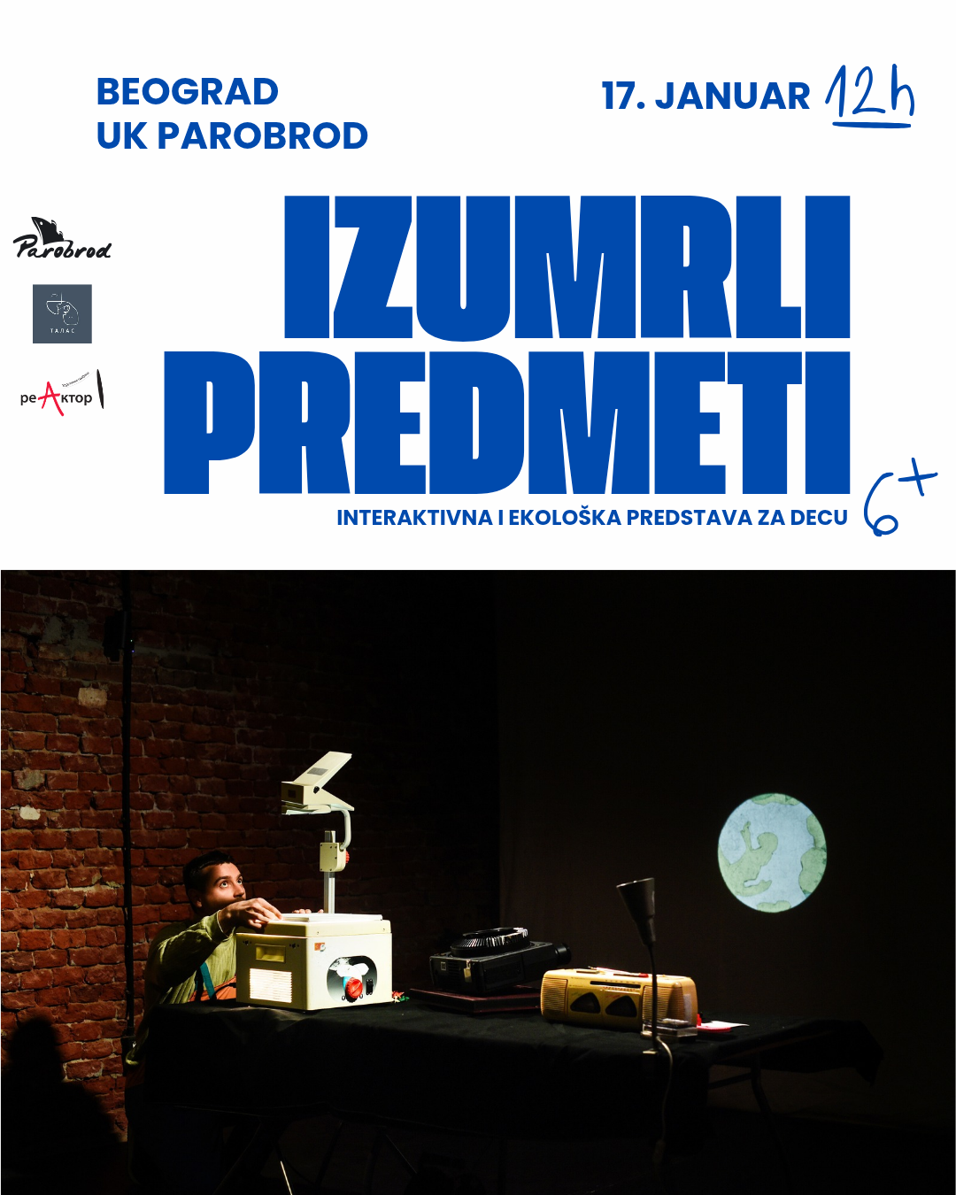 Izumrli predmeti je interaktivna predstava koja povezuje naizgled udaljene svetove: izumiranje dinosaurusa, nastanak plastike i nestanak predmeta koje smo nekada voleli. Kroz igru sa grafoskopom, diaprojektorom i kasetofonom, uređajima koji su vremenom zaboravljeni, publika ulazi u prostor sećanja, mašte i novih mogućnosti, otkrivajući da smo sličniji nego što mislimo.