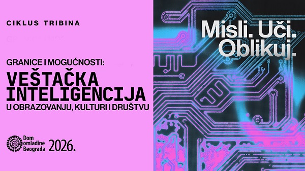 Dom omladine Beograda u okviru svog tribinskog programa pokreće ciklus „Granice i mogućnosti: Veštačka inteligencija u obrazovanju, kulturi i društvu", naučno-stručni sadržaj koji će tokom 2026. godine biti realizovan kroz šest tematskih susreta. Svaki susret kombinuje stručna izlaganja i panel diskusije, uz dodatnu radionicu namenjenu nastavnicima jezika i književnosti. Ulaz je slobodan za sve zainteresovane posetioce.